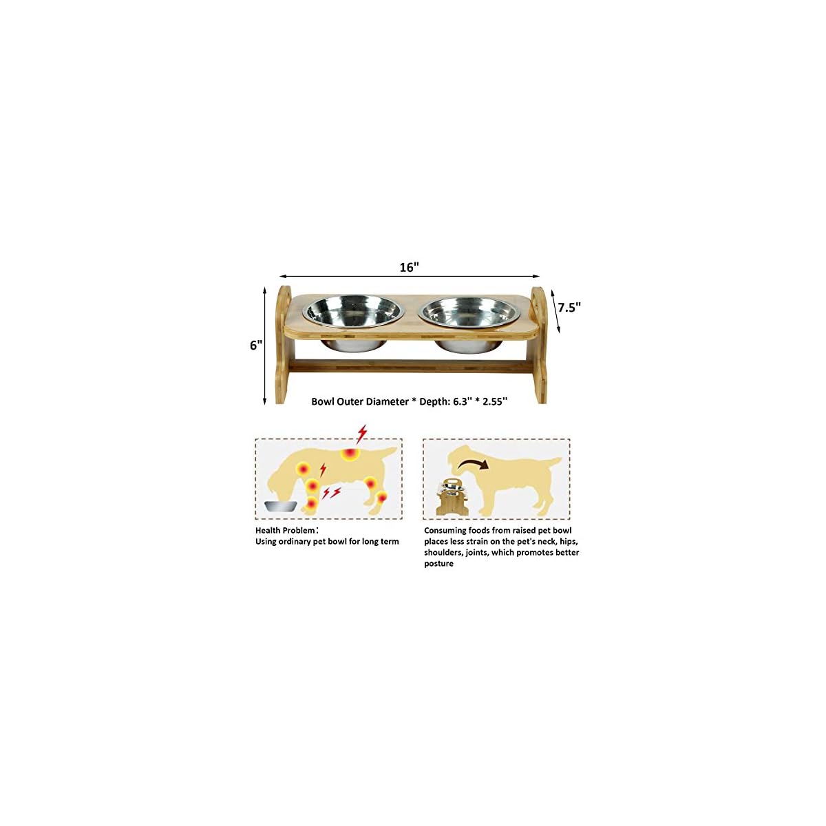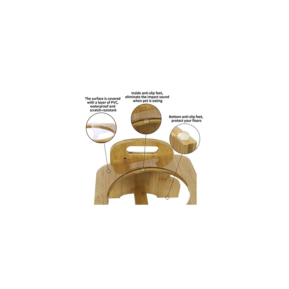 Water Resistant & Anti Slip:This dog food stand is made from bamboo which have high water resistance properties. The surface is covered with a layer of PVC, waterproof and scratch-resistant. Equipped with Anti-slip feet on bowl insets which eliminated the impact sound when pets are eating.The dog feeders elevated with anti slip feet make it stable and does not slide easily, it prevent your pet from sliding bowls around and provide protection for your floors.