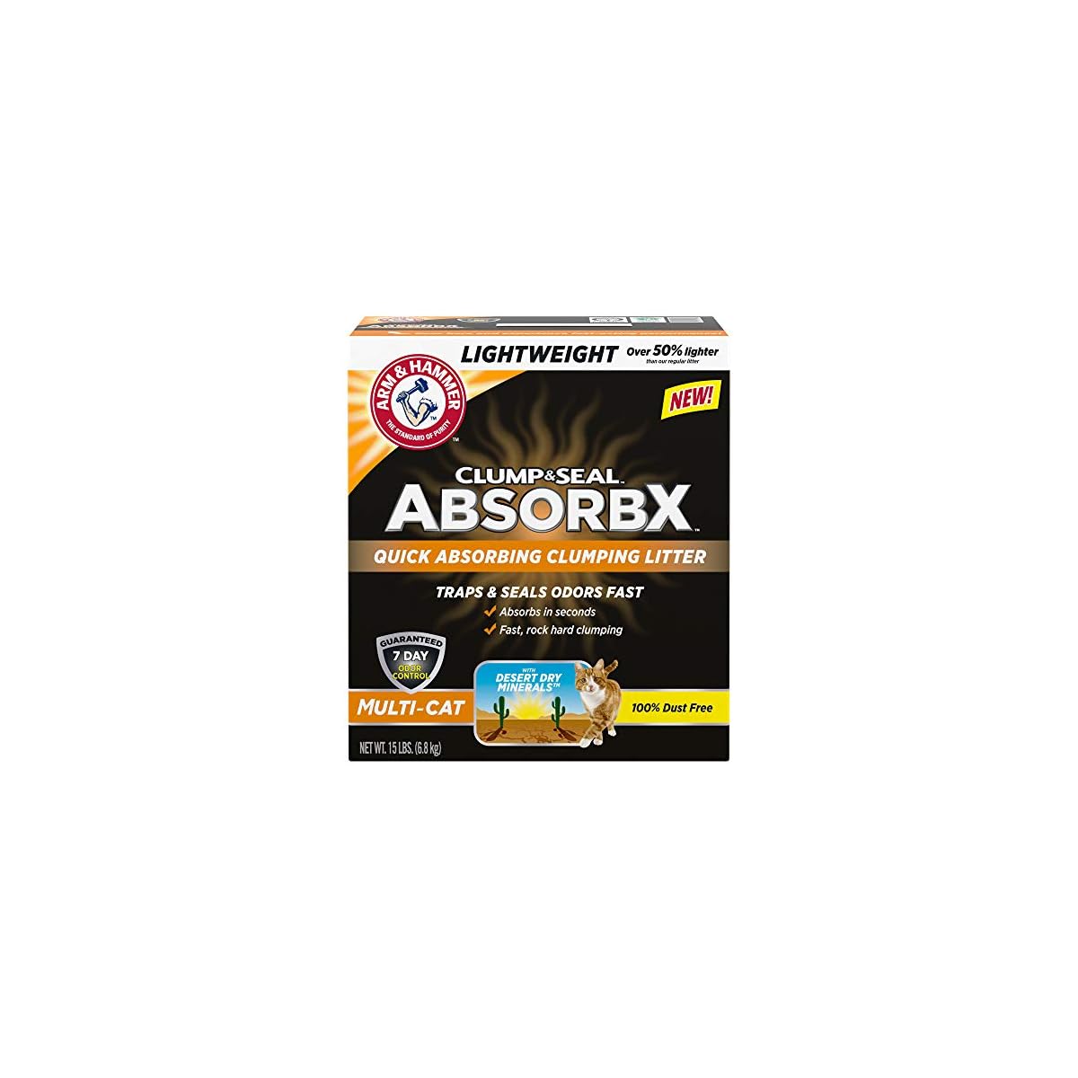 With ARM & HAMMER Clump & Seal AbsorbX Multi-Cat quick absorbing clumping cat litter, say goodbye to lingering wetness. Our formula is made with all new, desert dry minerals that quickly absorb wetness and odors. Clumps harden quickly so they’re ready for scooping when you are, plus an easy care cat litter formula that is over 50% lighter than our regular cat litter. Clump & Seal technology seals and destroys odor for 7-Day Odor-Control, Guaranteed. Fellow cat lovers like you put their trust ARM & HAMMER.