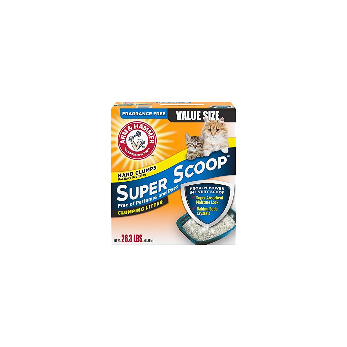 ARM & HAMMER Super Scoop Cat Litter is a low tracking clumping litter with super absorbent clay and ARM & HAMMER Baking Soda to eliminate odors. Specially designed formula for fragrance sensitive cats and their owners that forms rock solid clumps for easier scooping.