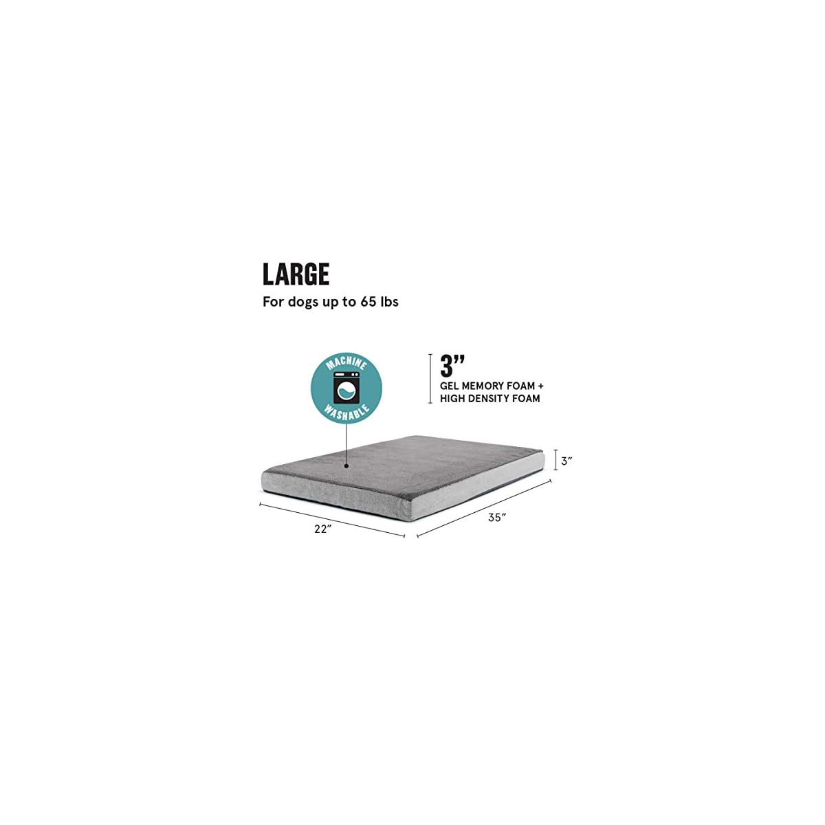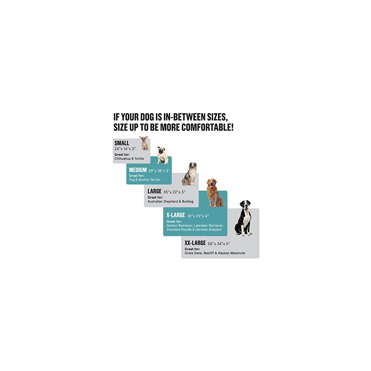 Multiple sizes: Pick the perfect size for your pup! *Please note, we’ve recently made size improvements.* Available in Small (24” x 16” x 3″), Medium (29″ x 18″ x 3”), Large (35” x 22” x 3”), X-Large (41″ x 29″ x4”), and XX-Large (50” x 34” x 5”). Arrives as a vacuum-packed bed in a box, easily unzip and let it inflate for up to 72 hours!
