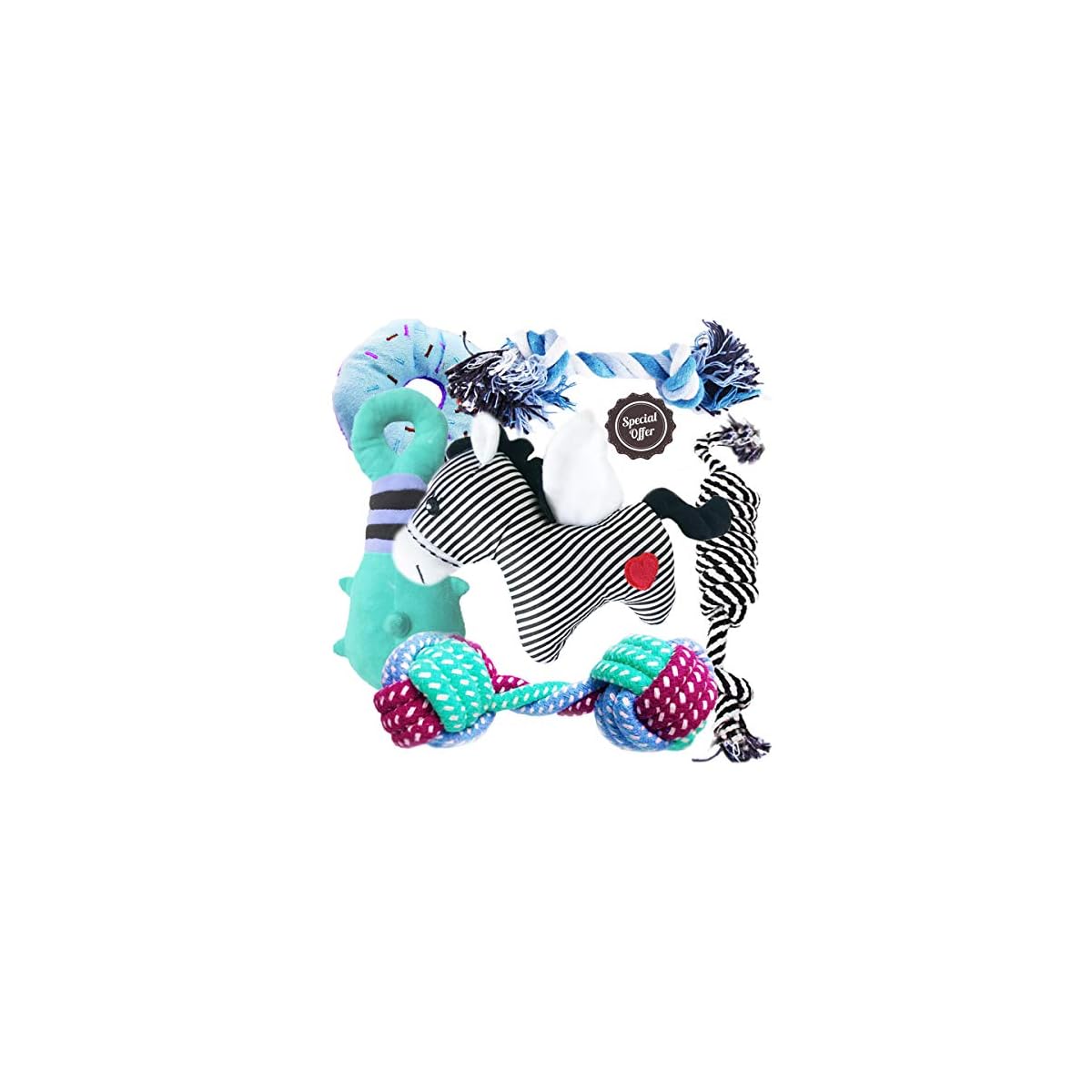 ♥VARIETY OF DOG TOYS:Including a squeaky zebra, ropes, donuts. Dog chew toys set