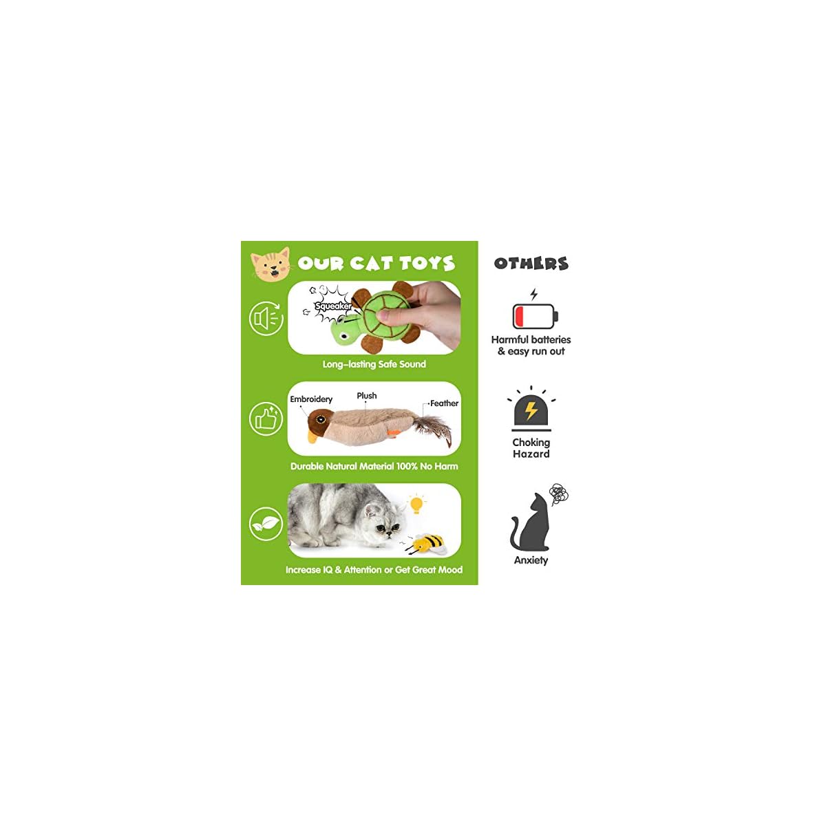 🐱【Cat Toys with Three Attractive Sounds】They squeaks, crinkle, rattles. 12 toys include with 4 squeaky+4 rustling+4 roll rattles. Different gently squeak to pay cats more attention to play toys, not ruin your furniture or shoes. Kittens can bite/roll/shake/press them to make surprise noises keep them more interested or entertained all day. Our best cat toys surely last longer than electronic/batteries noise, ours can make sounds permanently.