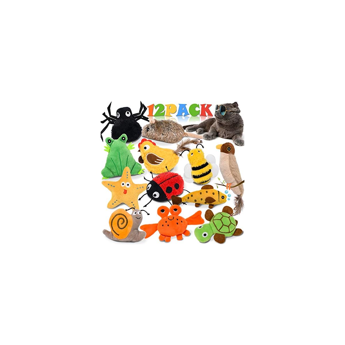 🐱【Super Value Cat Animals Toys Set】12pack, unique plush stuffed animals toys, keep cats to pounce, chase, play, excite their natural instincts. Perfect for pet indoor/outdoor playtime, small & realistic, include ocean stuffed animal set: fish, starfish, turtle, crab; farm & jungle stuffed animal set: bird, frog, ladybug, snail, honeybee, spider, chicken, mouse. Ideal gift for cats of all ages. Great worth gifts for birthday or festival.