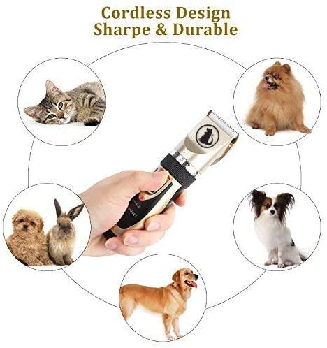 【CORDLESS 】Light weight and cordless design for easy use. The pet grooming kit is equipped with a charger. Charging for five hours, pet grooming clippers can sustain uses of 70 minutes. With the cordless clipper, you can no longer be bothered by the trouble of replacing batteries or boring wires.but aslo available for cord.