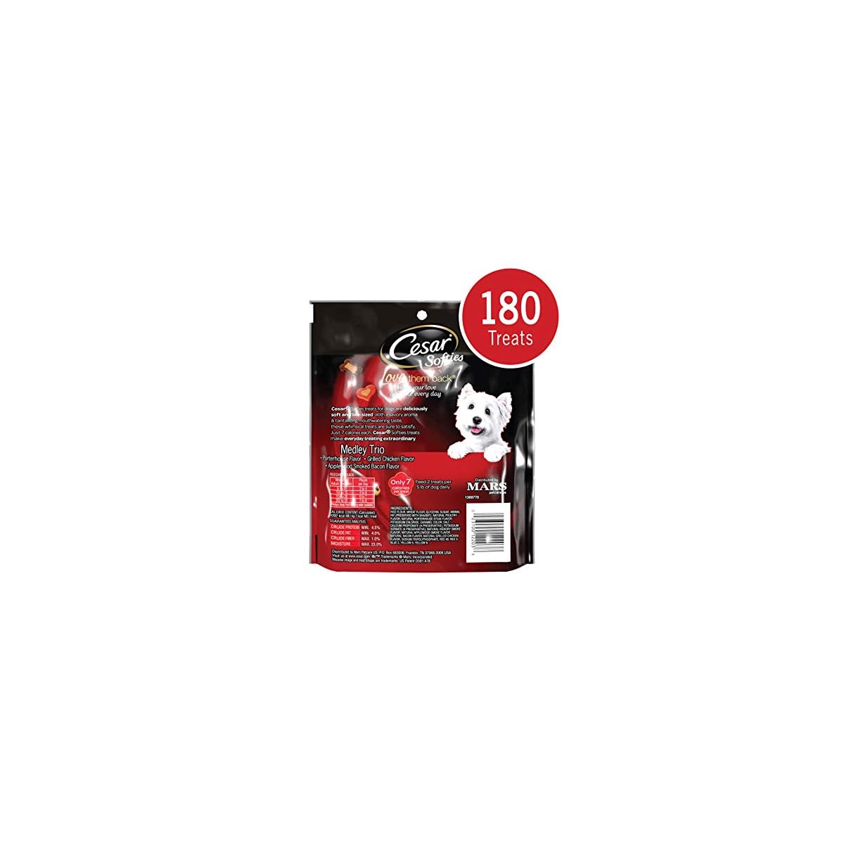 Contains one (1) 16 oz. 180-count pouch of CESAR SOFTIES Dog Treats Medley Trio