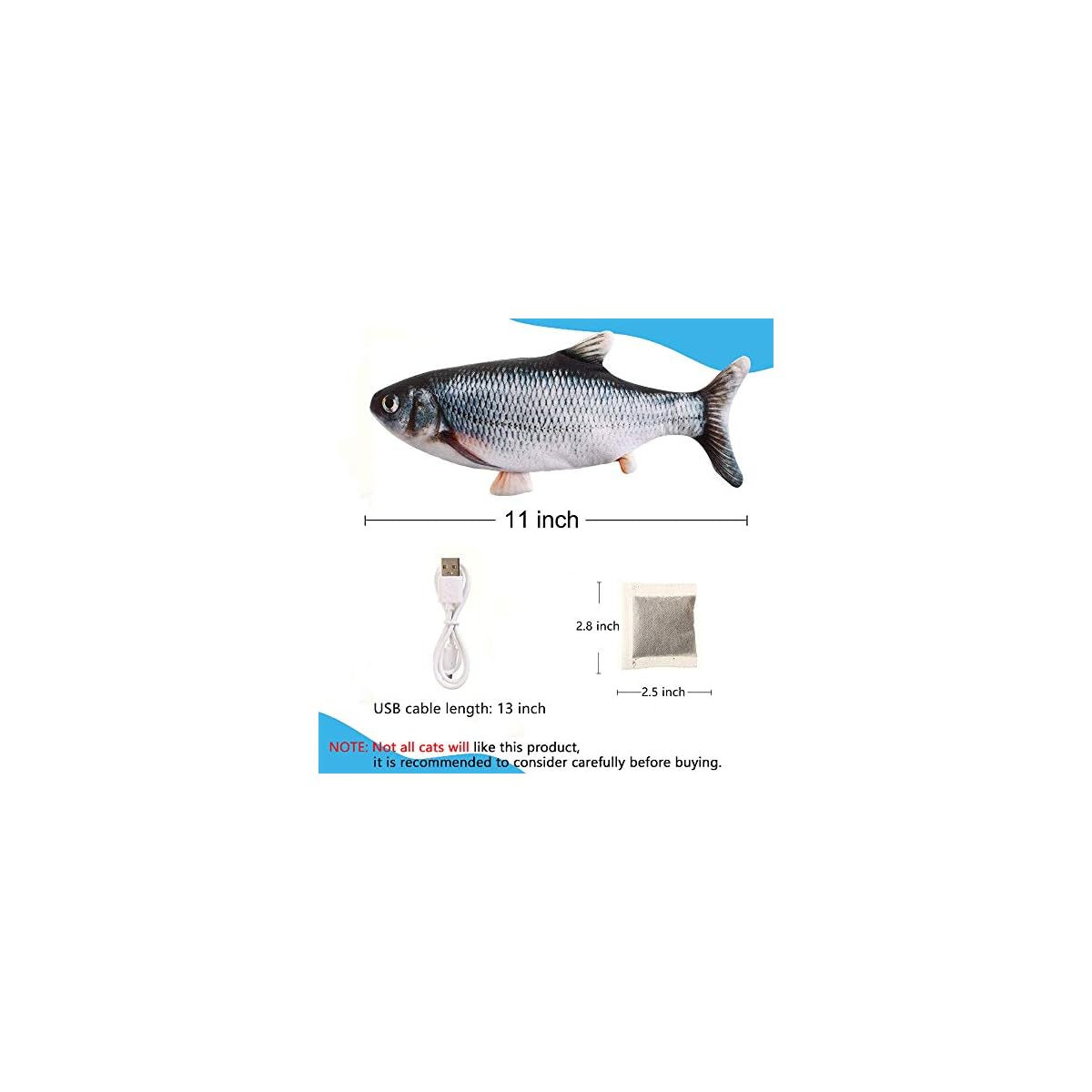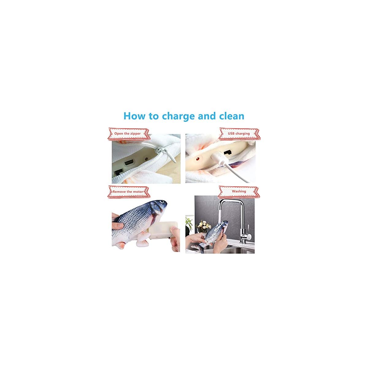 🐟【USB Rechargeable】 It’s easy to charge the fish toy, just open the zipper and plug in the USB cable. And the motor is removable, when you clean this fish toy, please remember to take the provided catnip pack and motor out of the fish belly.