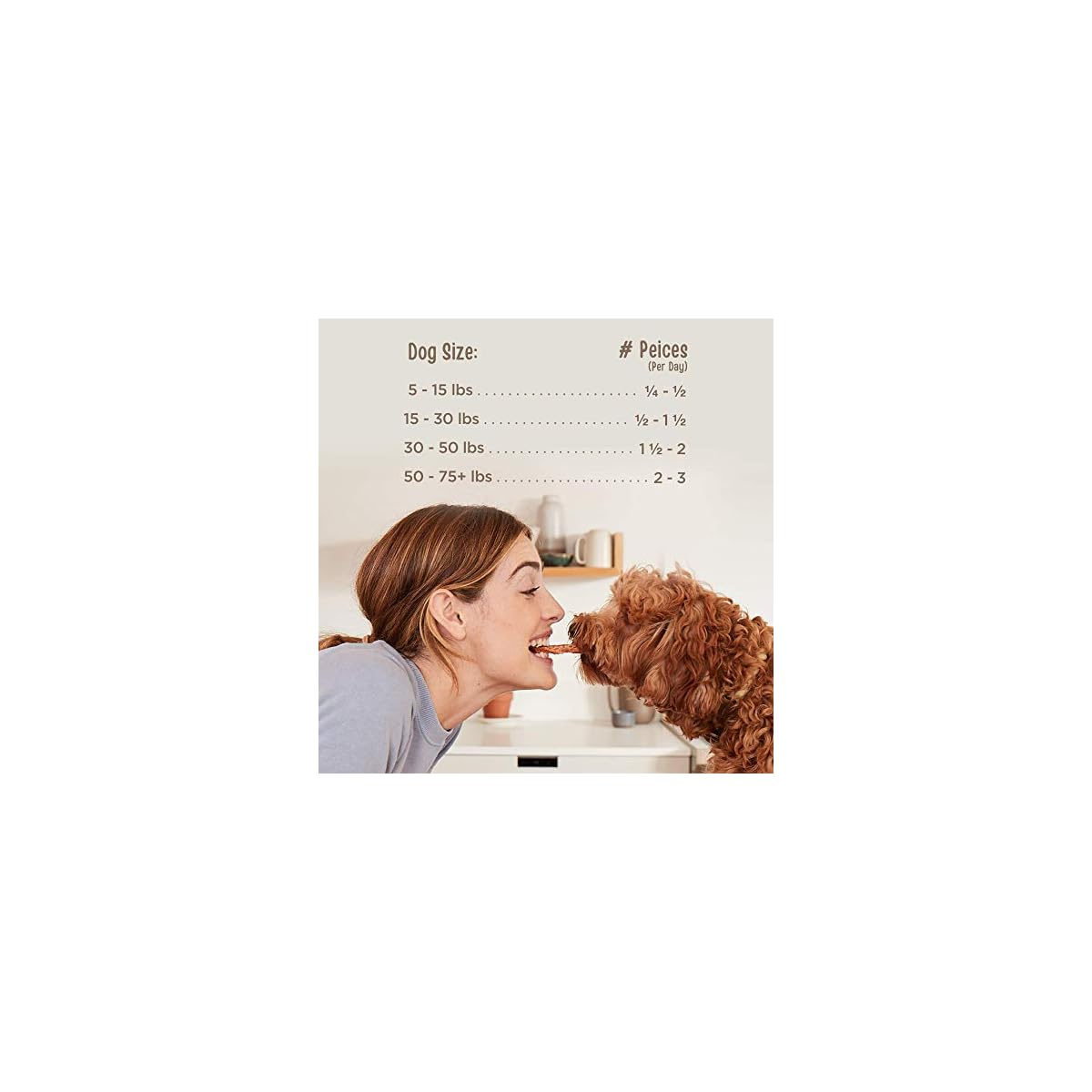 Recommended feeding amounts are based on your dogs weight. be sure to provide plenty of fresh drinking water while feeding. Pieces per Day by Dog Weight: 5-15lbs ½ – 2 treats; 15 – 30lbs 2 – 4 treats; 30-50lbs 4 – 6 treats; 50-75+lbs 6 – 8 treats