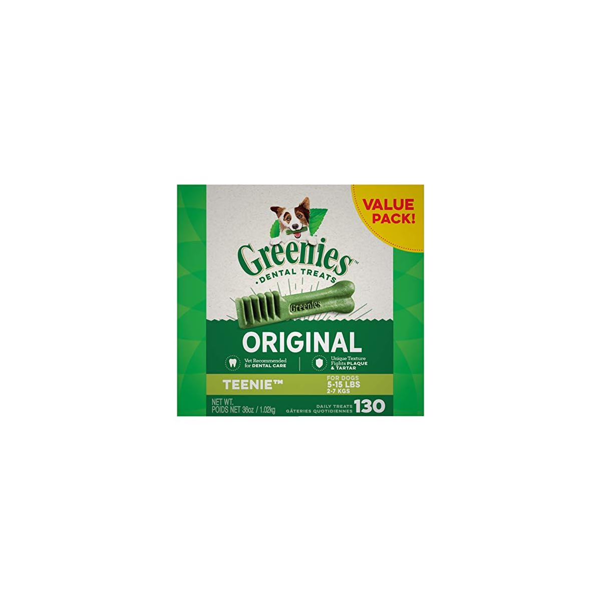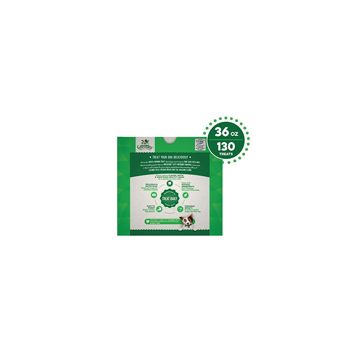 Contains one (1) 36 Ounce 130-count pack of Greenies original teenie Natural Dental Dog Treats; Natural Dog Treats Plus Vitamins, Minerals and Other Nutrients