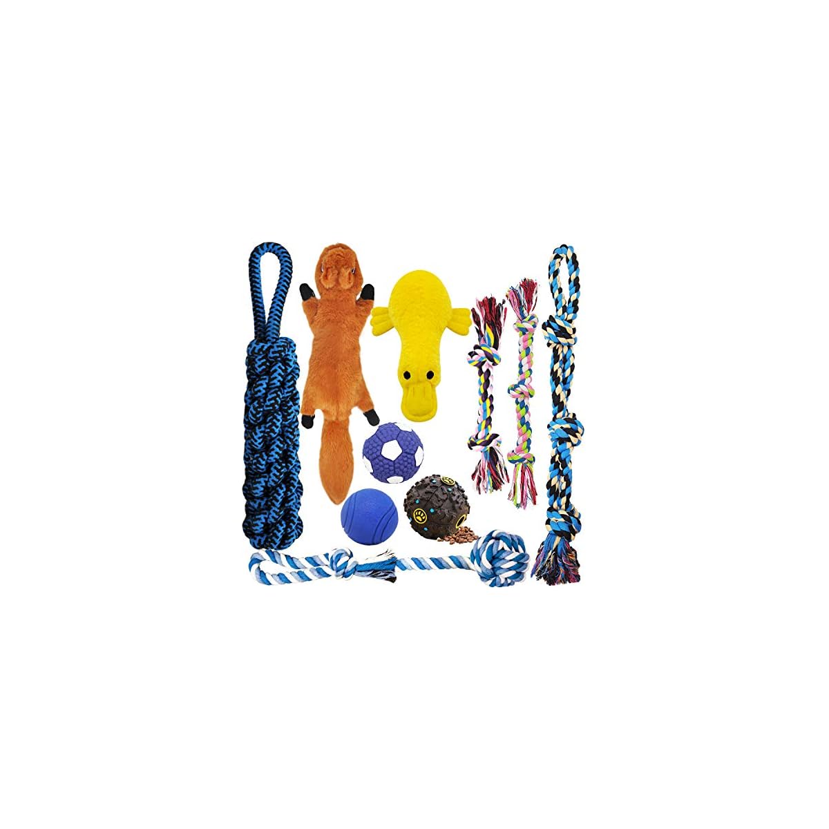 Dog Toy Set 10 pack include dog toys for aggressive chewers rope dog toys tug of war and squeaky dog toys, dog plush toys, dog toys balls, Latex made squeaky ball and fetch ball made of thick and durable rubber. IQ treat Ball’s color may vary for different batches. All products are made of natural cotton fiber,Latex and Rubber, No plastic includes safety, Non-toxic and no smell.