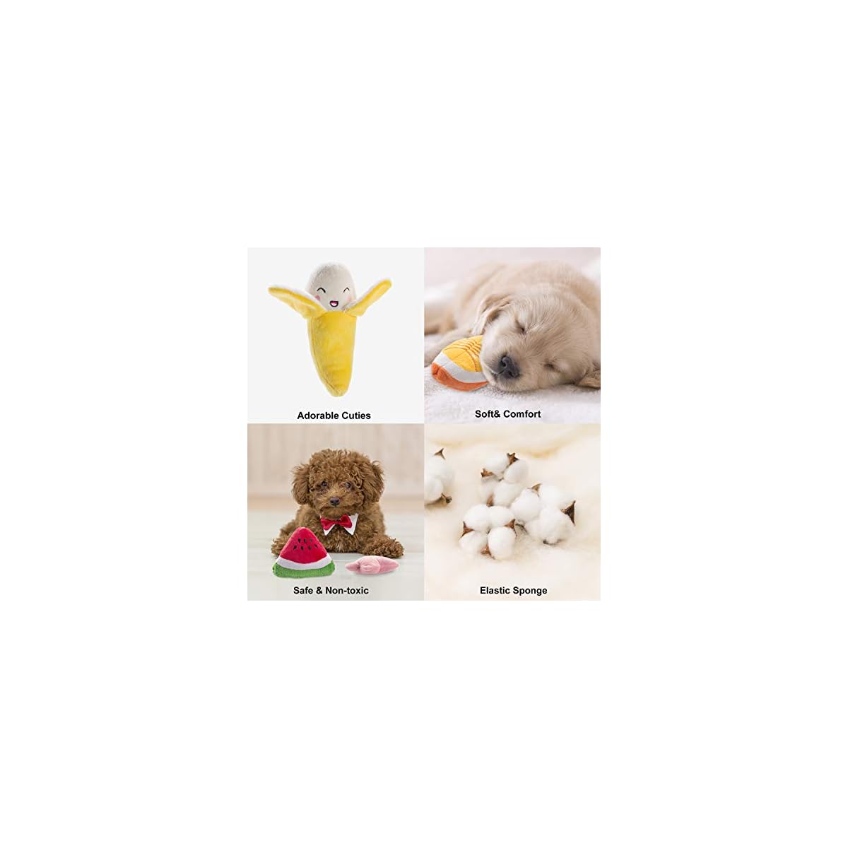 LOVELY SQUEAKY PLUSH TOYS-12 Pack-Includes watermelon(sphere, slice) Ice cream, star, banana, lobster, apple, chicken leg, orange, triangle watermelon£¬flip flop,pumpkin, carrot in cartoon figures. Their bright color and cute shapes are the dog’s favorites.