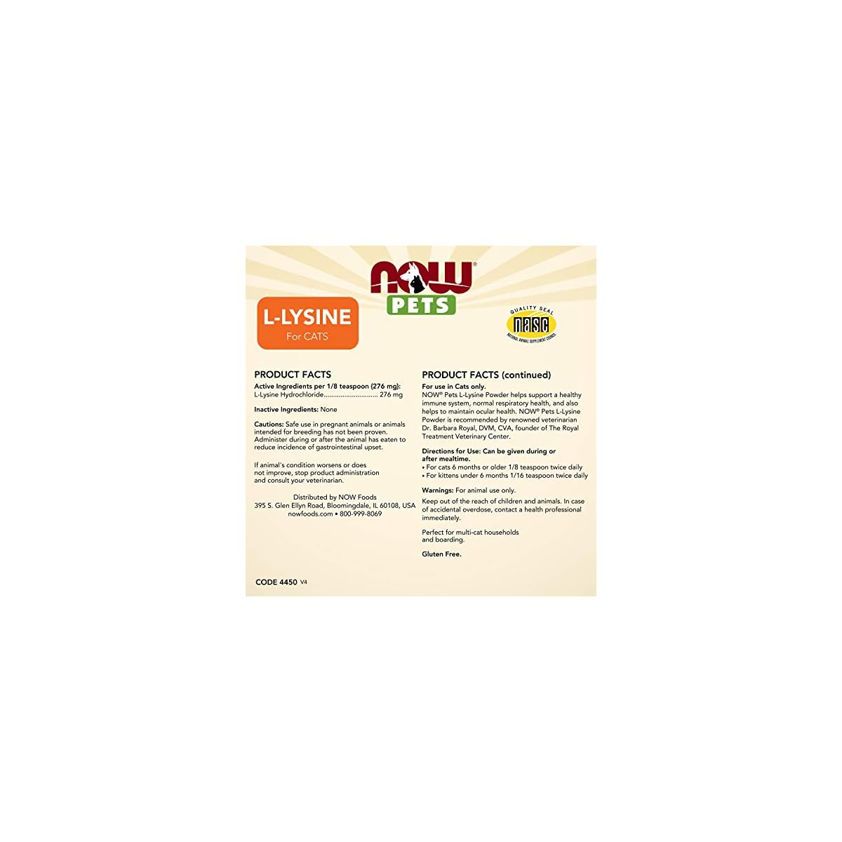 IMMUNE SYSTEM SUPPORT FOR CATS: NOW Pets L-Lysine Powder helps support a healthy immune system, normal respiratory health, and also helps to maintain ocular health. Give to your cat during or after mealtime. For cats 6 months or older 1/8 teaspoon twice daily and kittens under 6 months give 1/16 teaspoon twice daily.