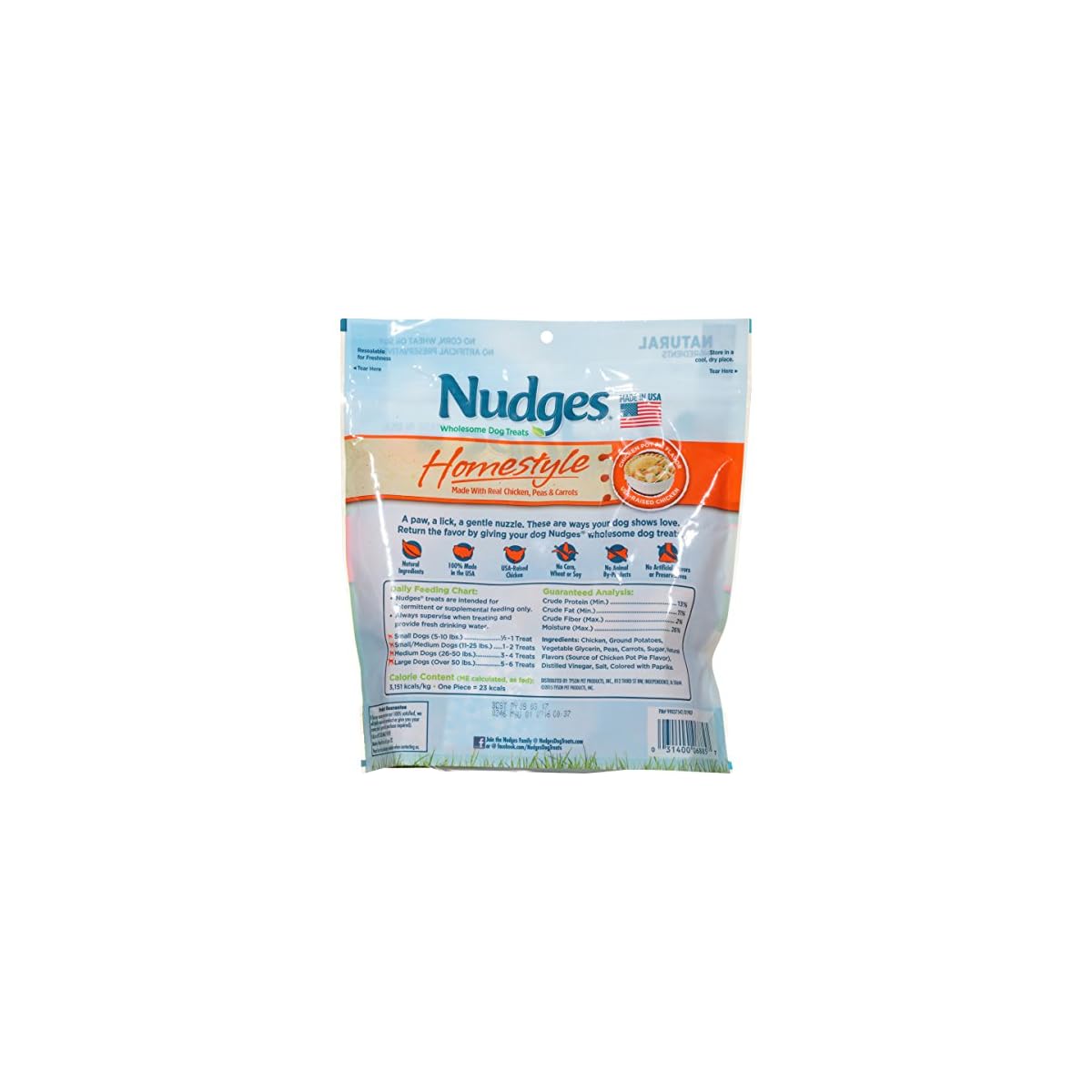 Made in the USA with real chicken as the #1 ingredient, These treats will excite your dog with meat that tastes like it came from the skillet. With no corn, wheat or soy, and no animal by-products, artificial flavors or preservatives, These tender treats give you an all natural way to delight your dog. Celebrate the joy with your buddy. Tell your dog You love them too with all natural Nudges dog treats. Say it with a nudge.