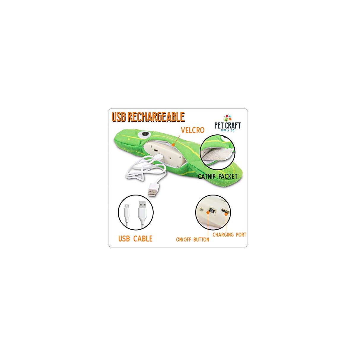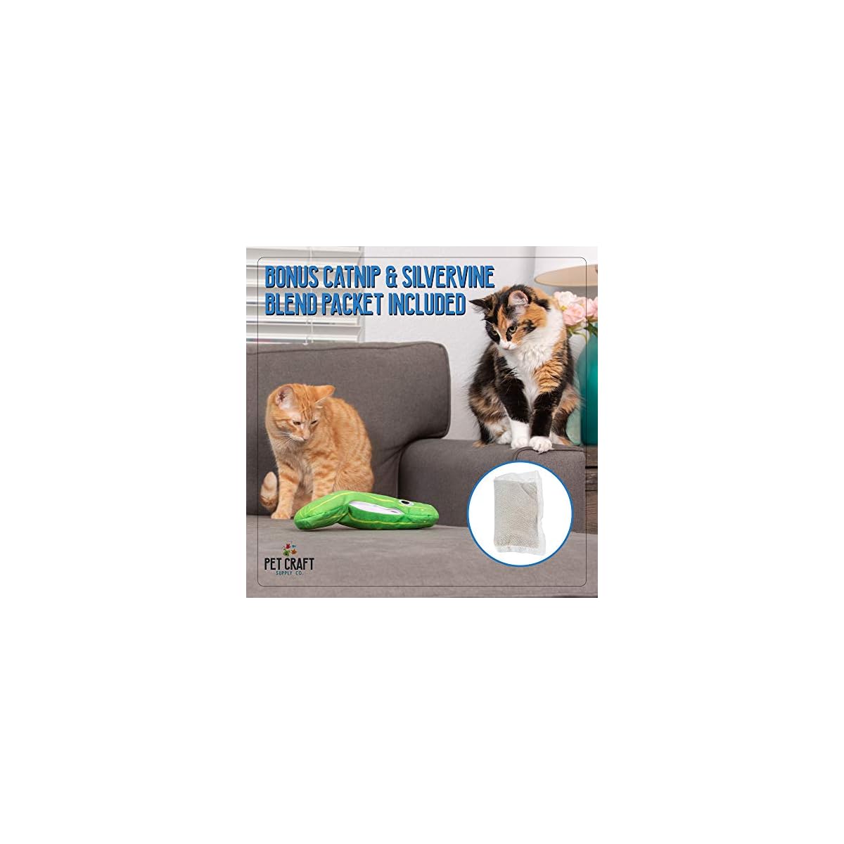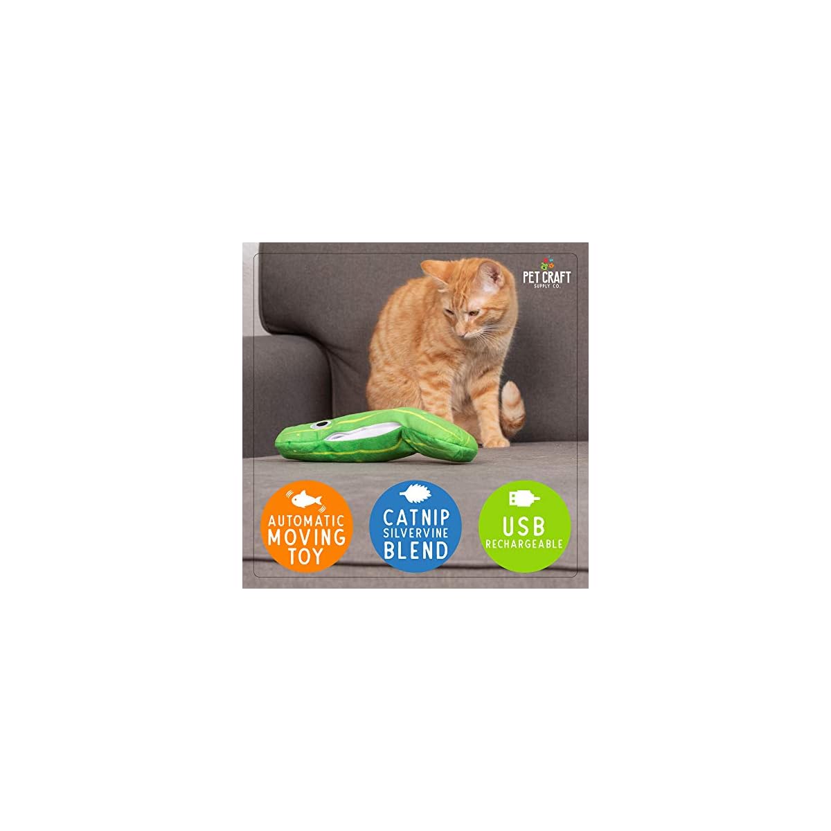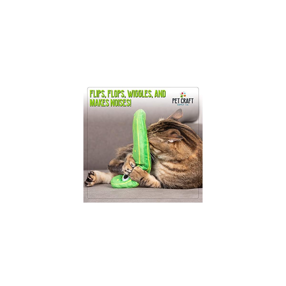AUTOMATIC MOVING CAT TOYS: Pet Craft Supply Wiggle Pickle Flipper Flopper Cat Toy flips, flops, wiggles, and makes noises. The built-in motion sensor activates every time your cat touches the toy, enticing your cat to kick and play.