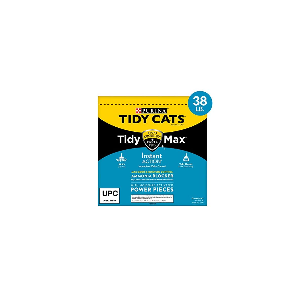 Put an end to overpowering odors in your home with Purina Tidy Cats Tidy Max Instant Action clumping litter for multiple cats. The litter includes Ammonia Blocker and an Absorptive Power Piece to deliver Max Odor and Moisture Control. We know you have no time to waste, and that’s no problem with this unique formula. This clumping cat litter is designed to trap odors right from the start, and the odor-neutralizing power protects against ammonia, urine and feces smells for all-in-one odor control. Put the guaranteed TidyLock protection to work and help lock away odors for a clean, fresh-smelling home so that you can feel confident inviting over friends and family. This litter formulated for multiple cats helps create an inviting atmosphere for your cats to tend to their personal needs. We back this Instant Action formula with our Tidy Cats guarantee.