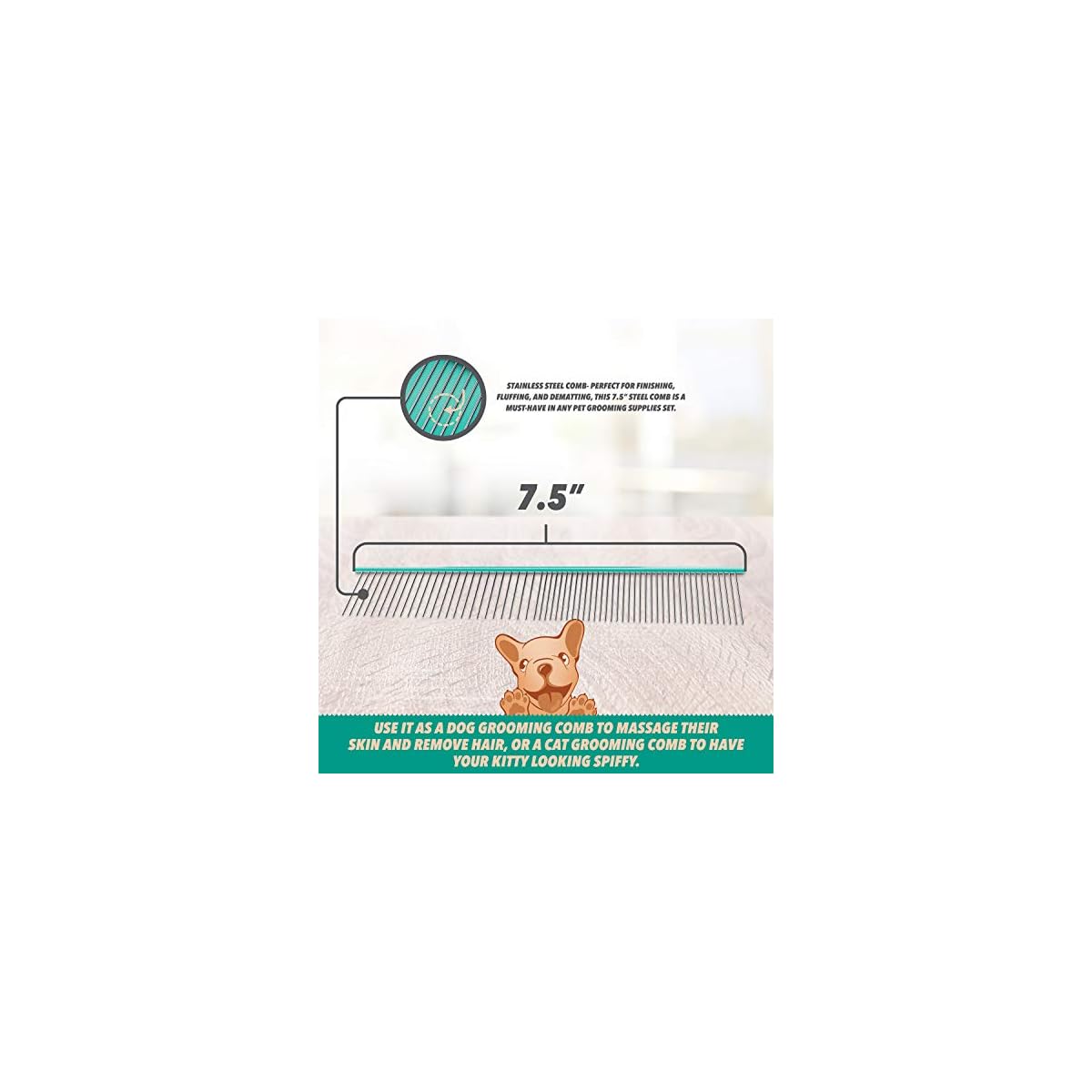 🐾 STAINLESS STEEL COMB 🐾 Perfect for finishing, fluffing, and dematting, this 7.5” steel comb is a must-have in any pet grooming supplies set. Use it as a dog grooming comb to massage their skin and remove hair, or a cat grooming comb to have your kitty looking spiffy.