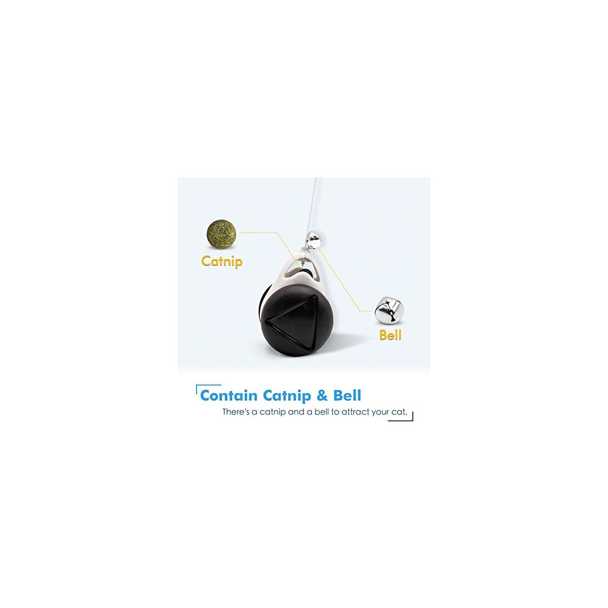 【Contain Catnip&Bell】There is one catnip ball and one bell in this cat chasing toy. It also has two type of heads that can be switched to so it doesn’t always have to be the same(one ball and one feather).