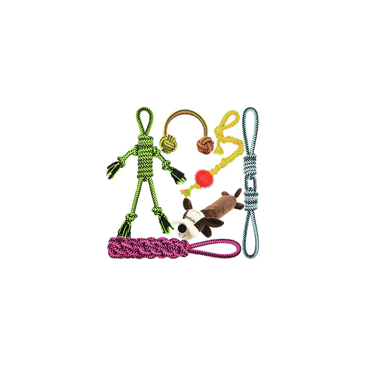 6design Dog Toys(Well Love Dog Toys 6pack Gift Set,Chew Toys,Squeak Toys,Dog Ball,Dog Bones,Plush Dog Toy,Dog Ropes,Tug of War Ball).