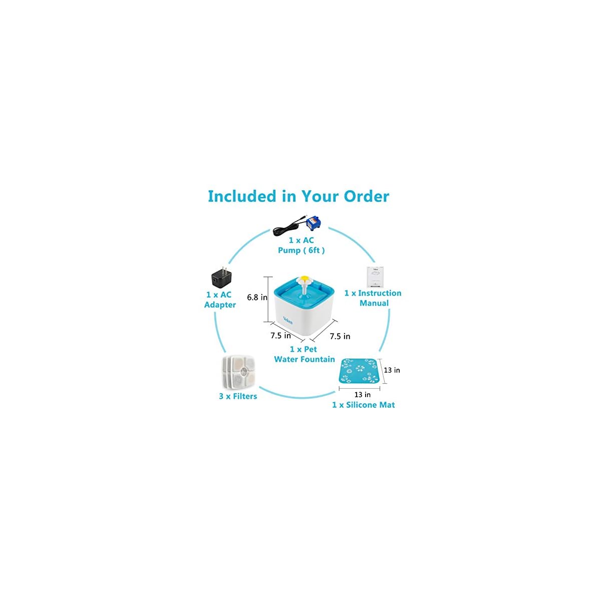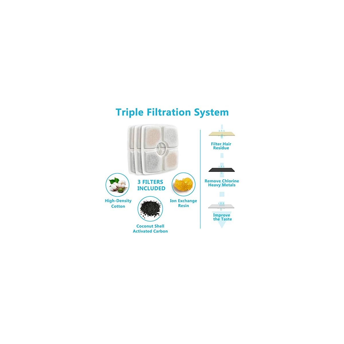 Triple filtration system – The pet water fountain is equipped with 3 replacement filters, each composed of a cotton layer, activated carbon, and an ion exchange resin, forming a triple filtration system to help keep your pets healthy and hydrated.