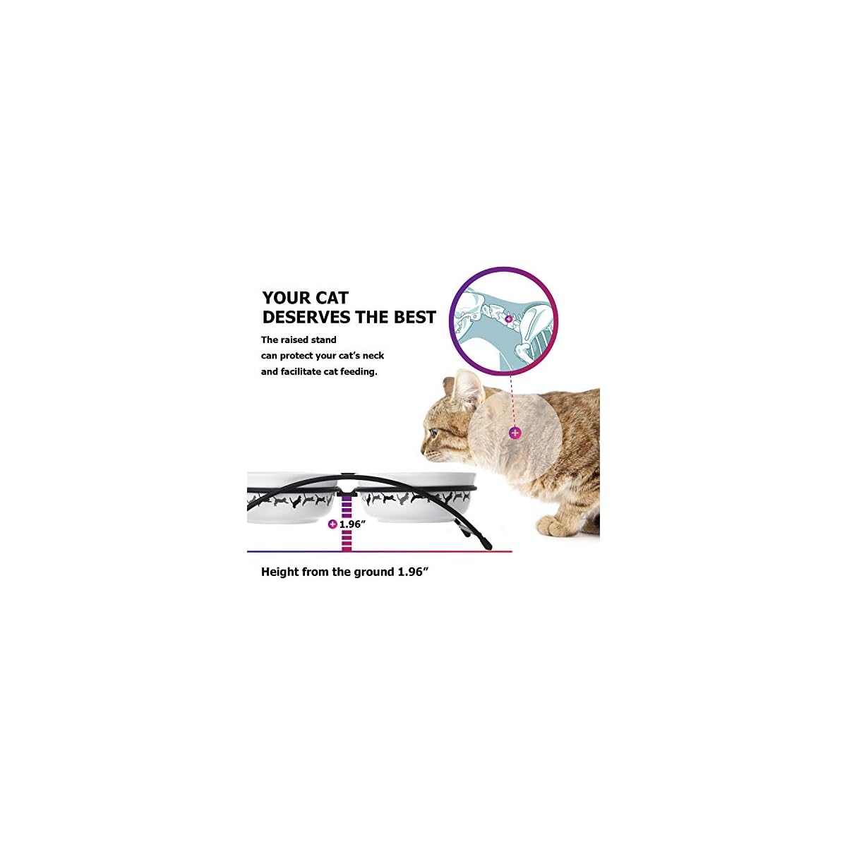 Reduce Neck Burden: the cat bowls have the right height, allowing the cat to eat in a more natural neck-position. Your cat could sit and eat quite comfortably.